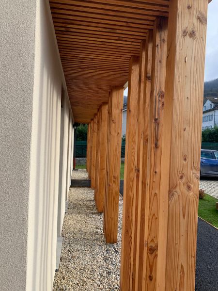 Très belle réalisation de nos partenaires charpentiers pour ce projet de maison médicale en Savoie. Vouillon a associé la fabrication de MOB – Murs Ossature Bois- à des éléments de charpenterie traditionnelle en bois Douglas Hors Aubier scié à moins de 30km de notre atelier par nos scieurs partenaires.